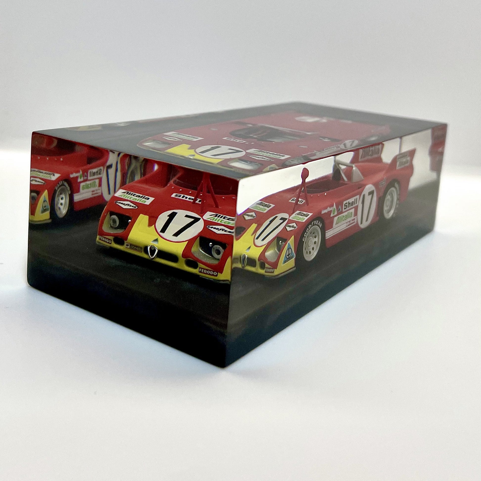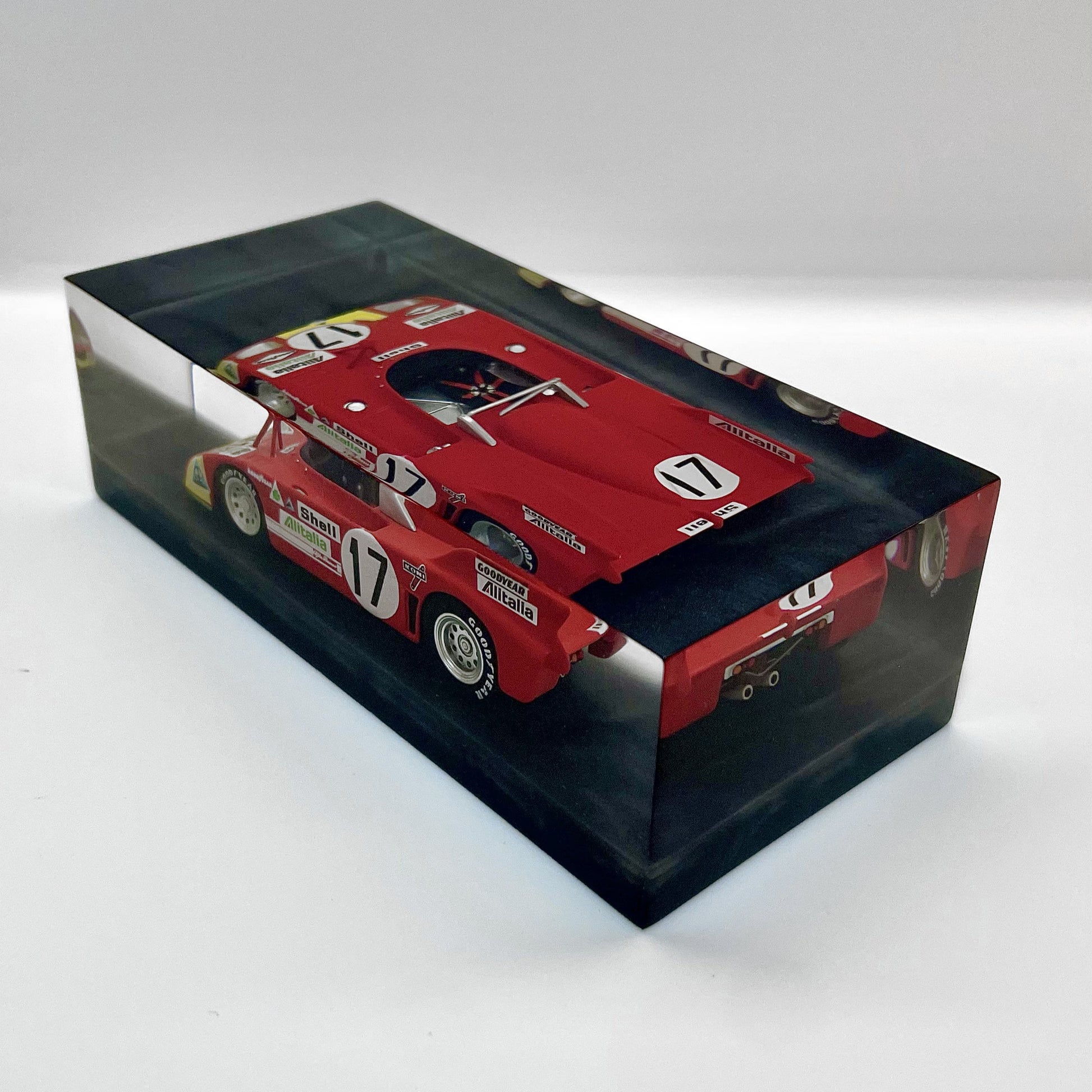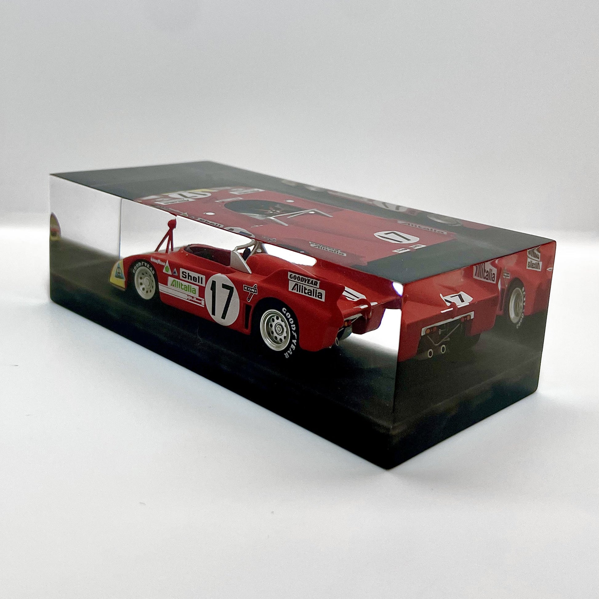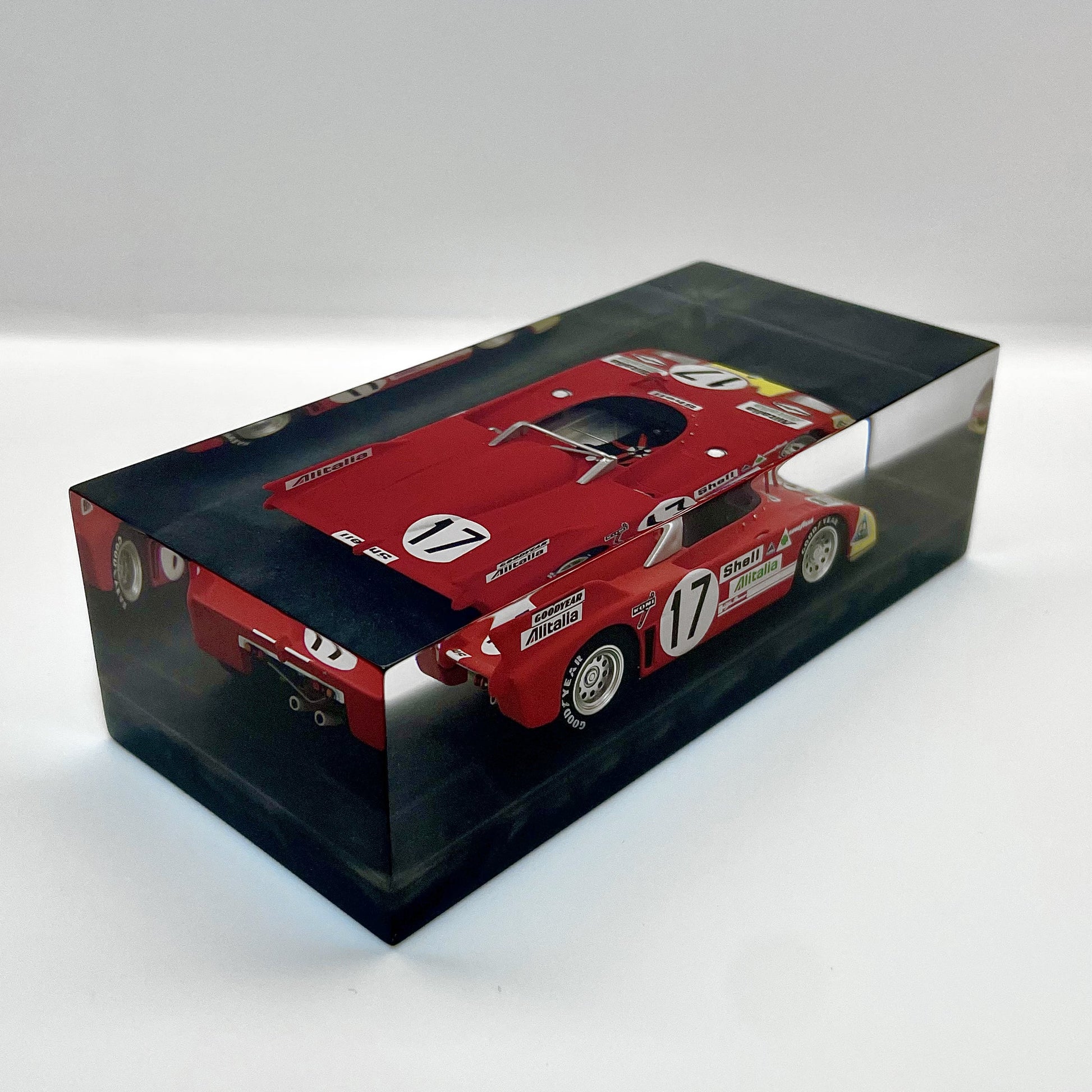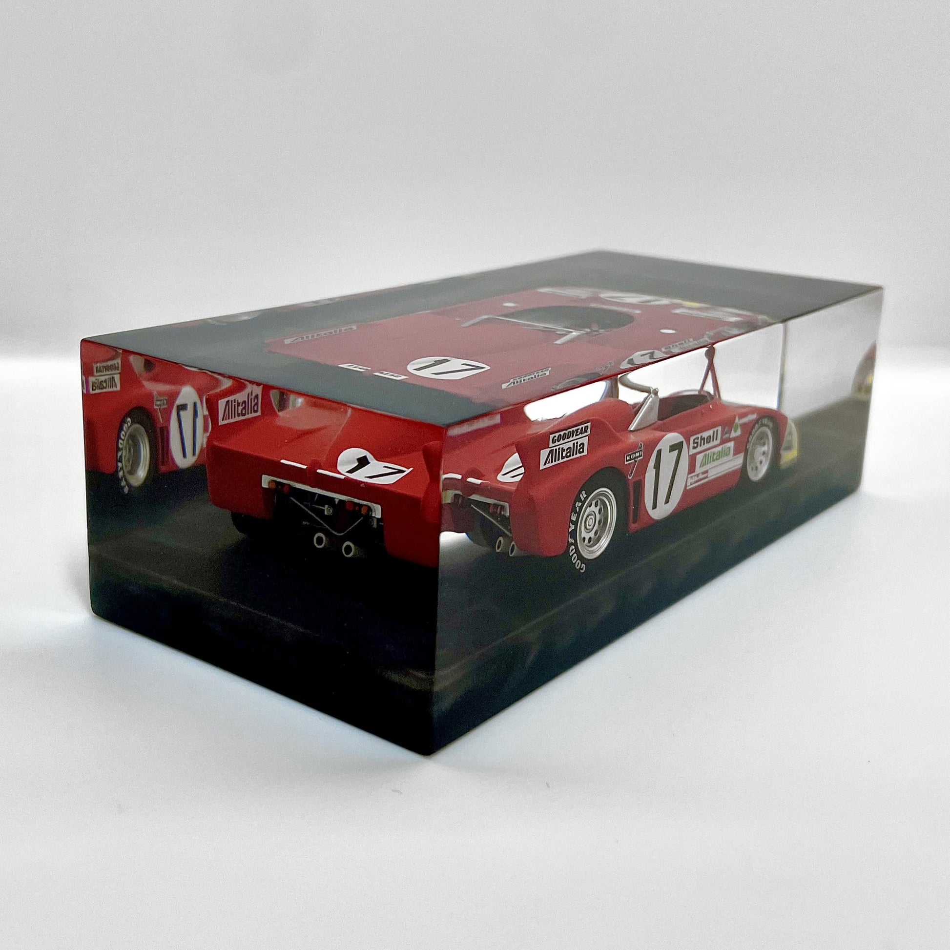 In this exclusive creation from the “Velocità Sigillata” series by XRACE Speedlovers, the Alfa Romeo 33 TT 3, which starred in the 1972 24 Hours of Le Mans with Helmut Marko and Vic Elford, is transformed into a timeless icon, sealed within a solid, transparent block with a clean and contemporary design.