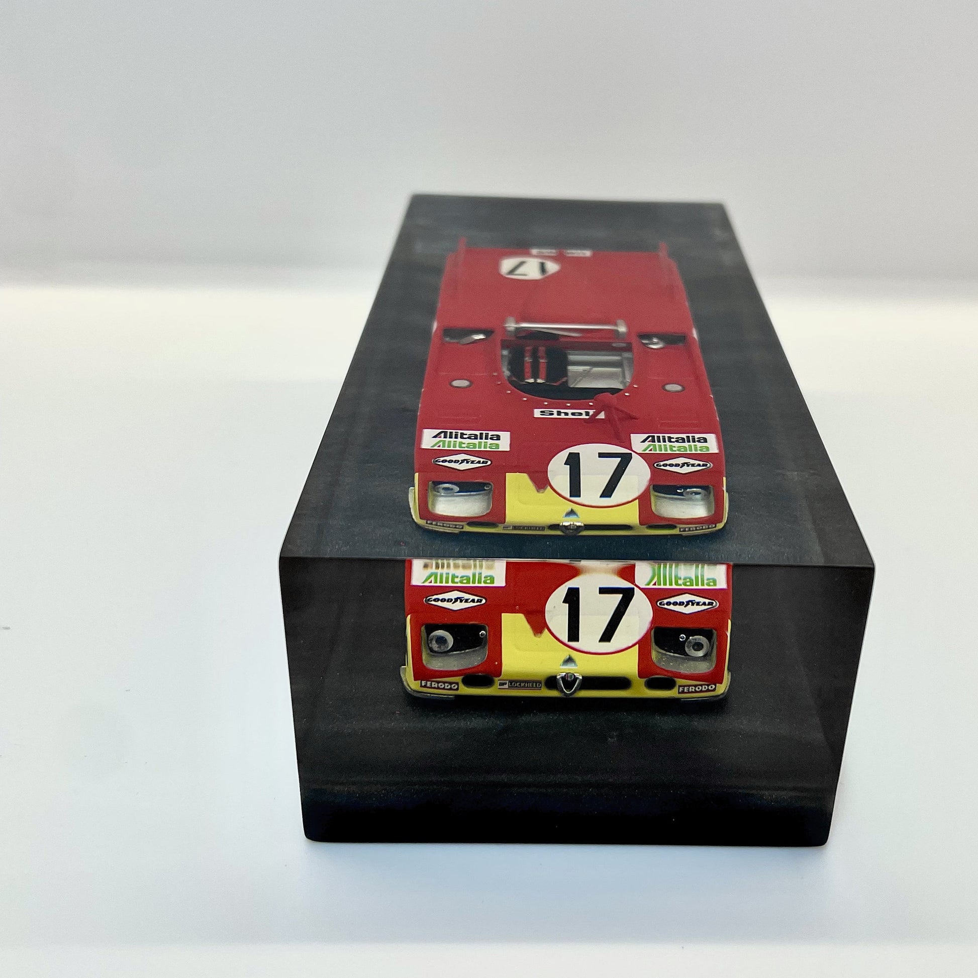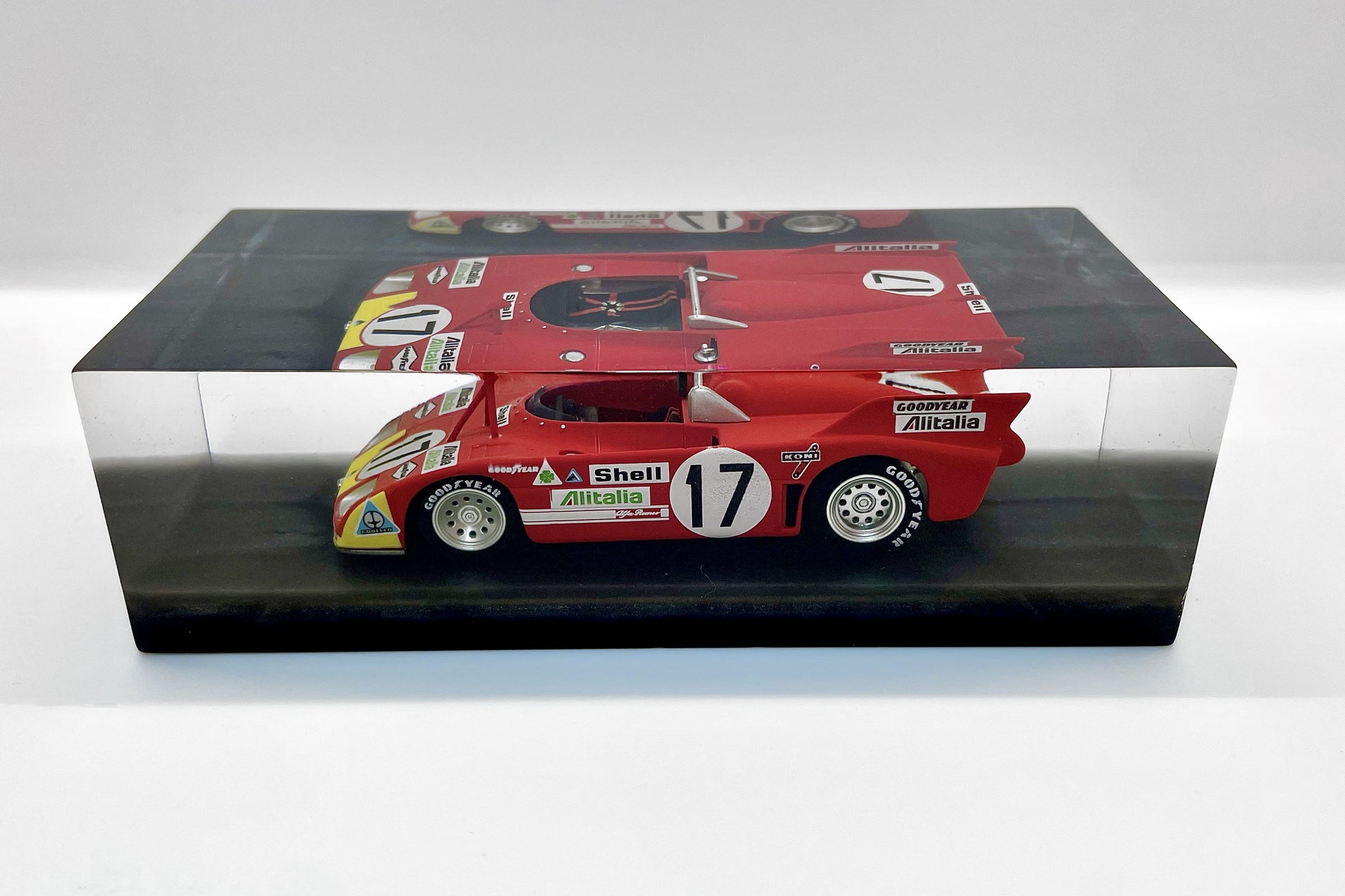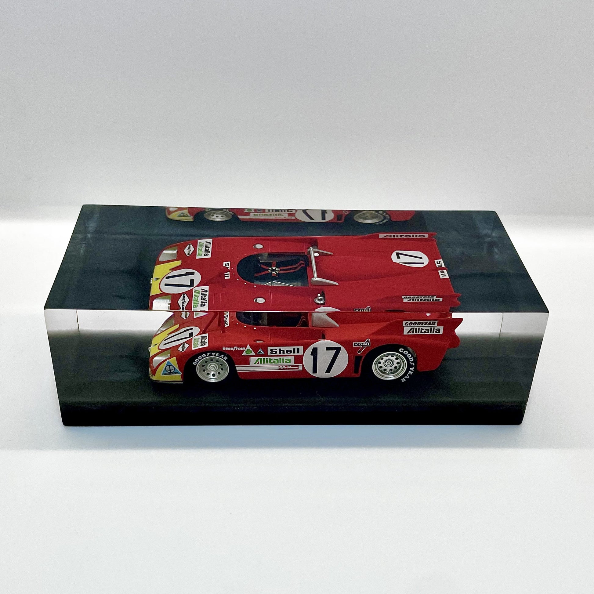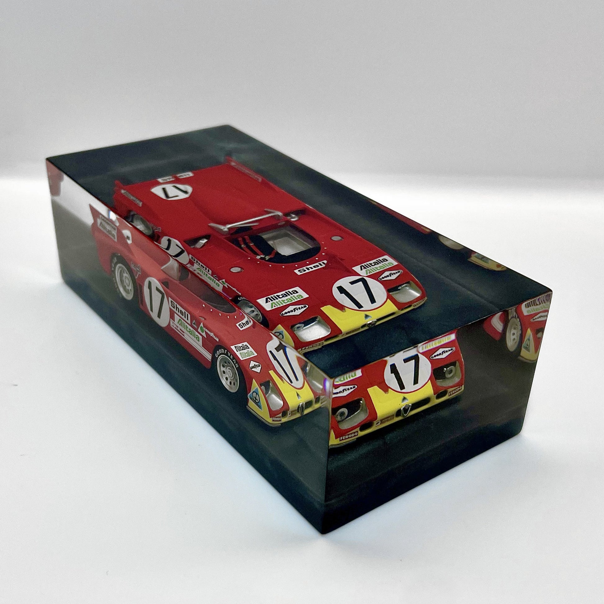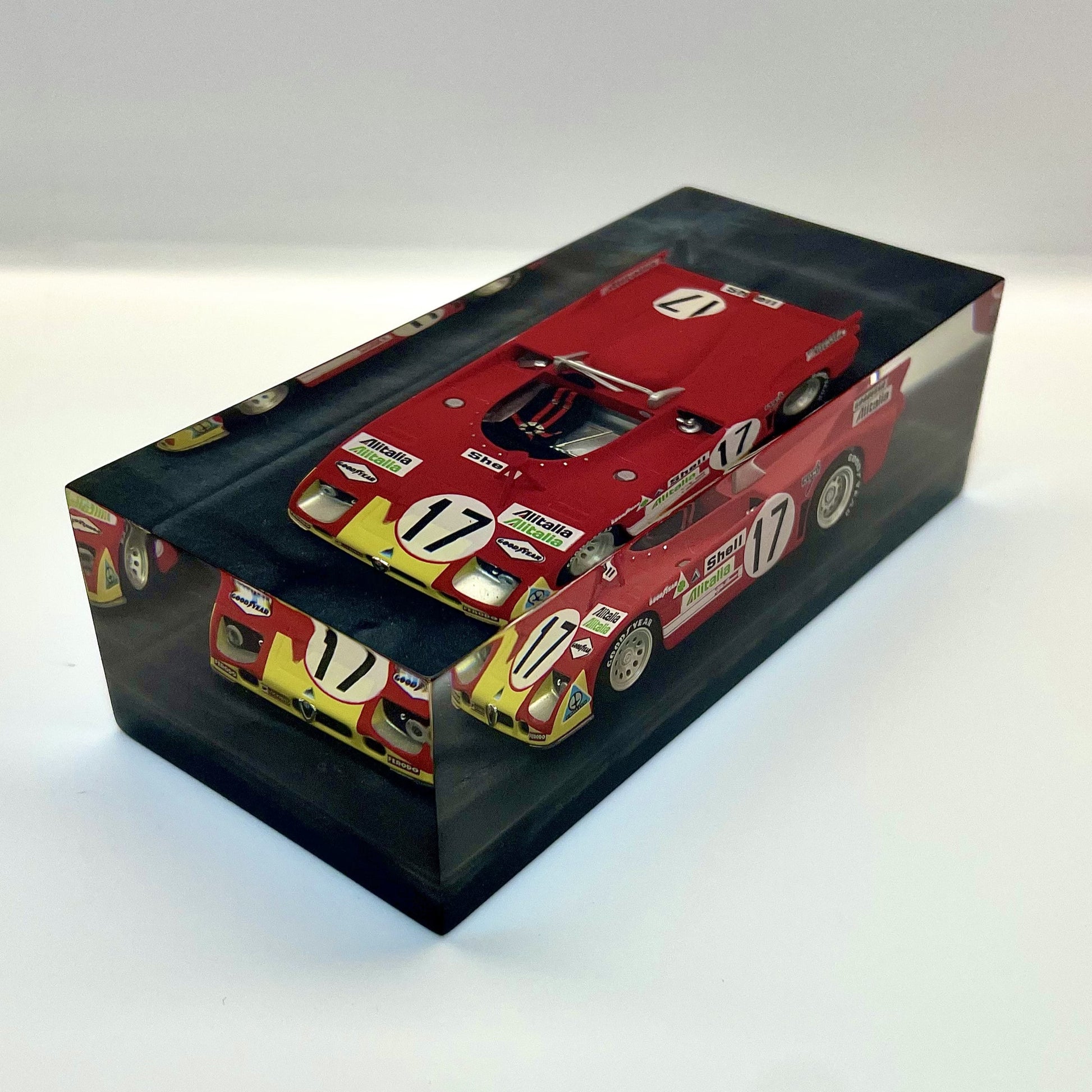 In this exclusive creation from the “Velocità Sigillata” series by XRACE Speedlovers, the Alfa Romeo 33 TT 3, which starred in the 1972 24 Hours of Le Mans with Helmut Marko and Vic Elford, is transformed into a timeless icon, sealed within a solid, transparent block with a clean and contemporary design.