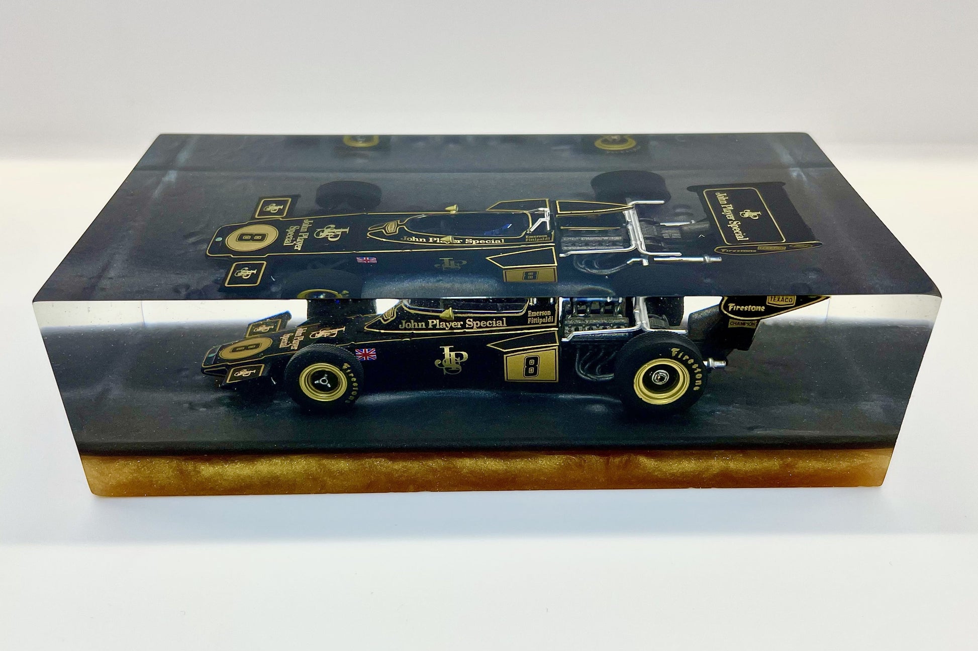 In this exclusive creation from the “Velocità Sigillata” series by XRACE Speedlovers, the groundbreaking Lotus 72D, driven by Emerson Fittipaldi during the 1972 season, is transformed into a timeless icon, sealed within a solid, transparent block with a clean and contemporary design.