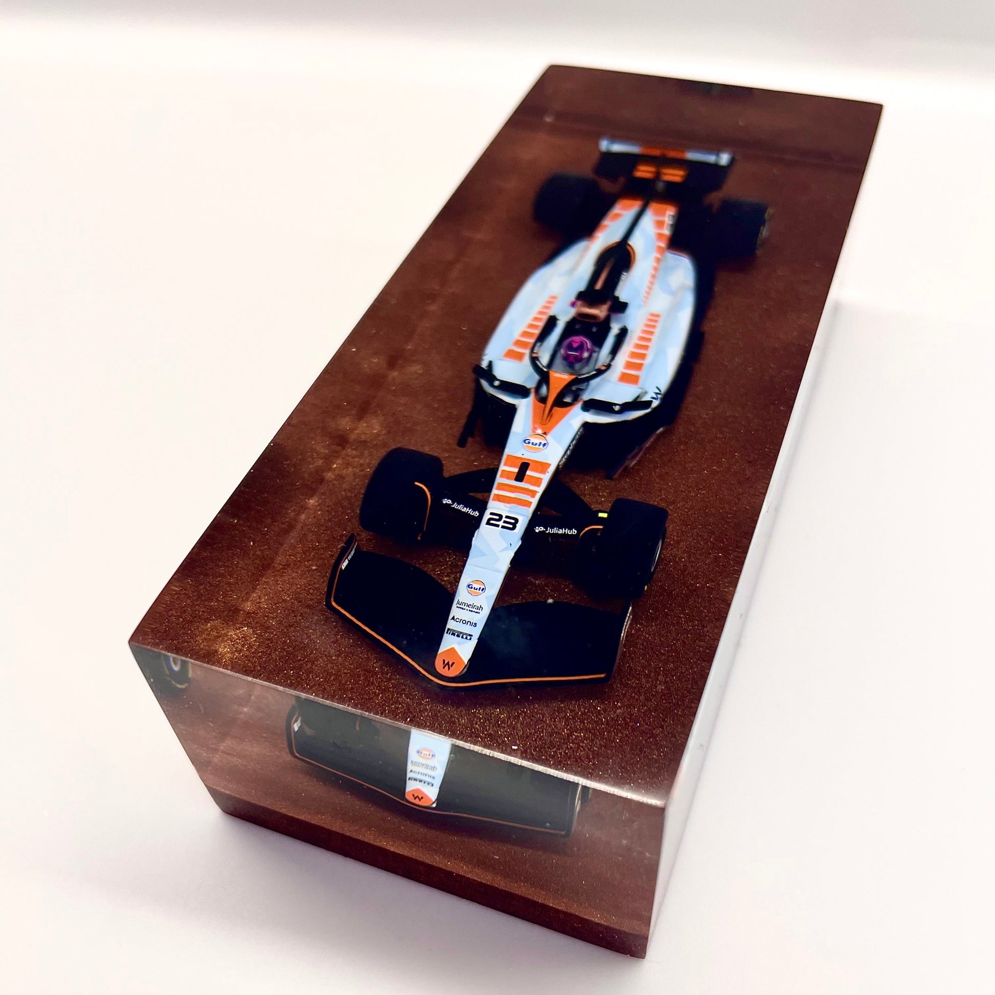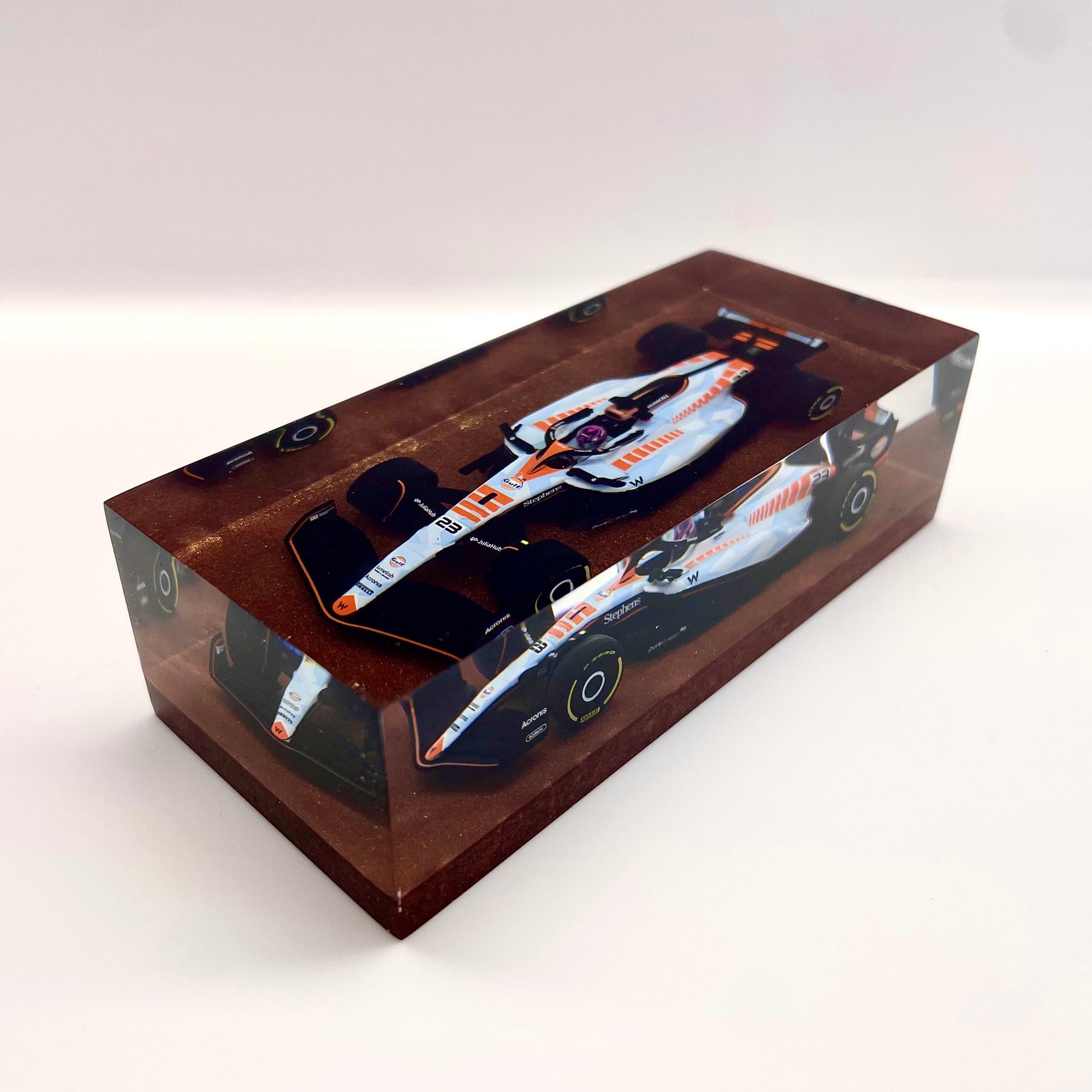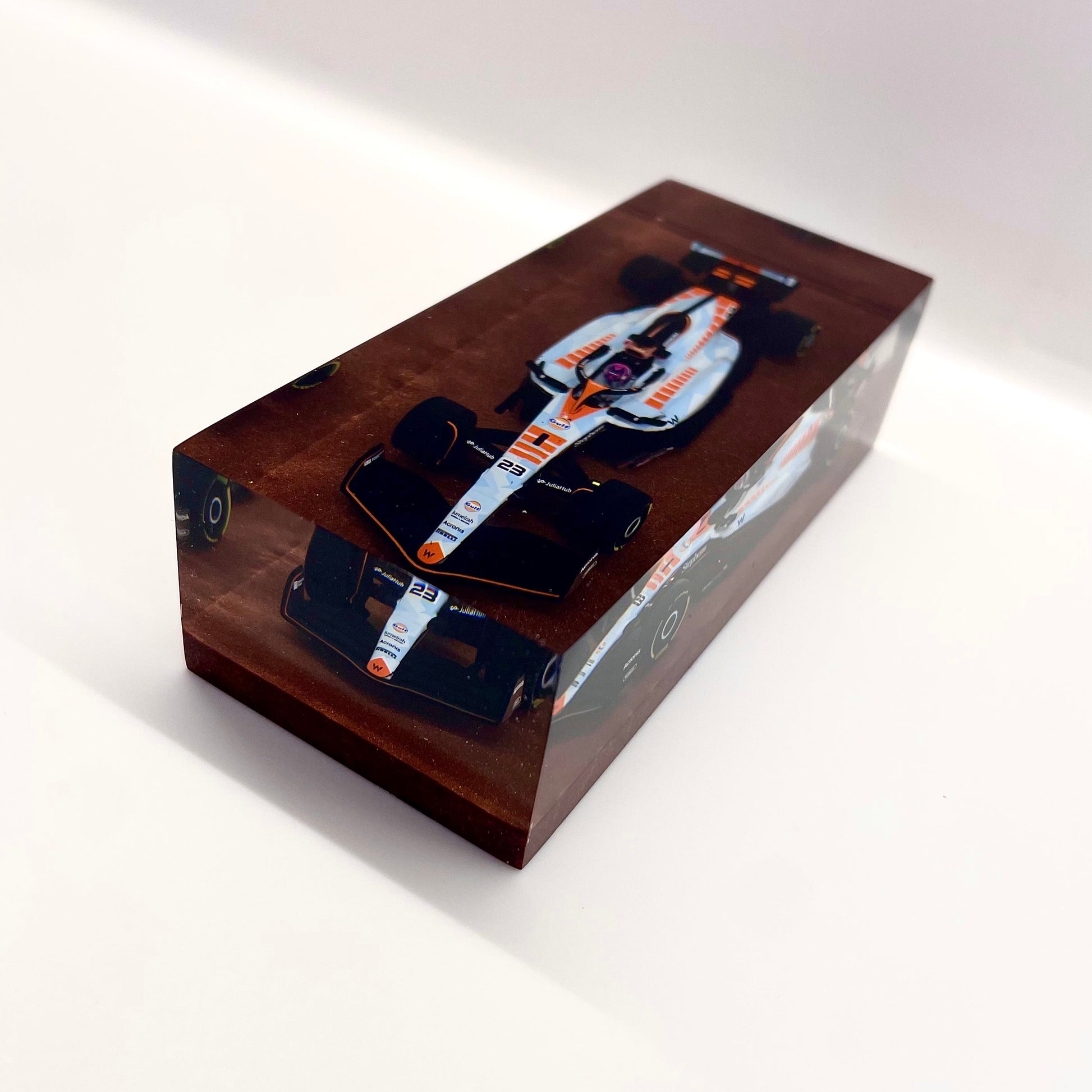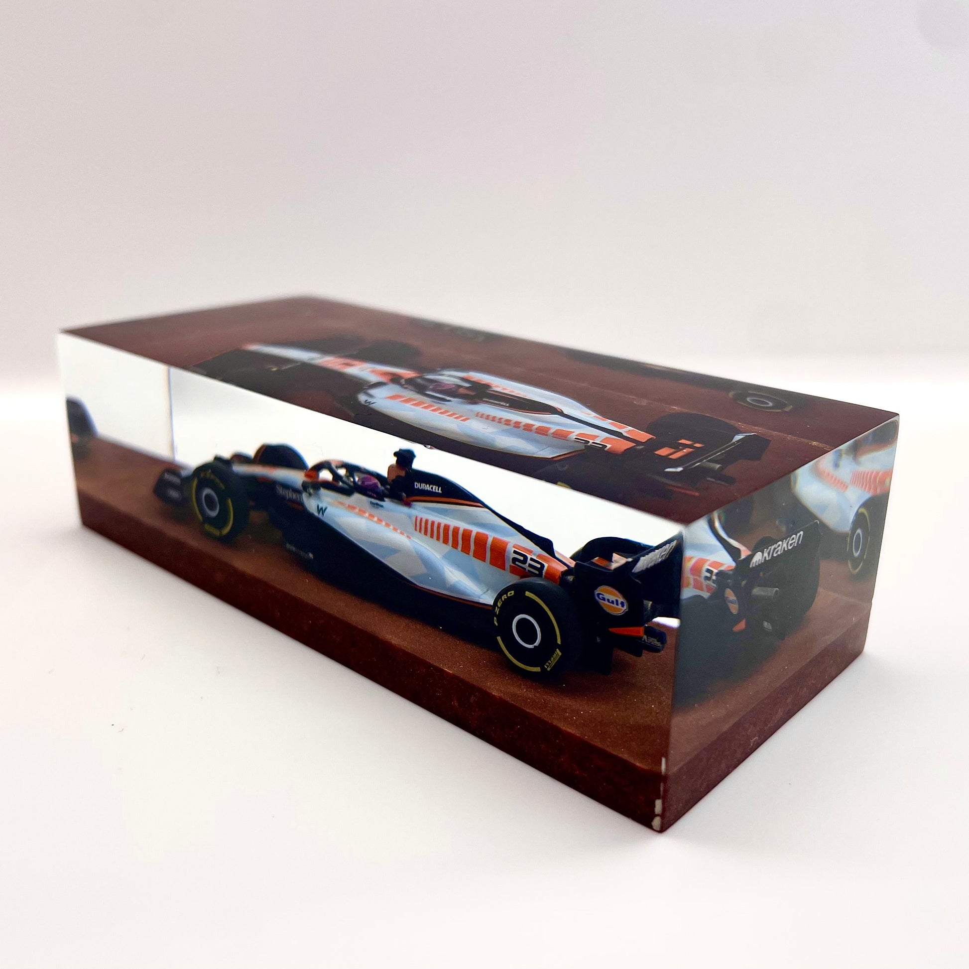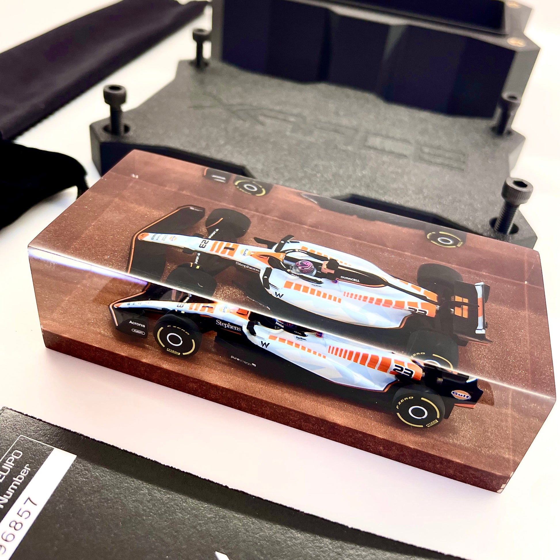 Il protagonista è l’elegante e aggressiva Williams FW45 guidata da Alex Albon durante il Gran Premio di Singapore 2023. Un simbolo di tecnica e velocità reso eterno attraverso un processo scultoreo che congela l’energia della gara in una forma pura e definitiva.