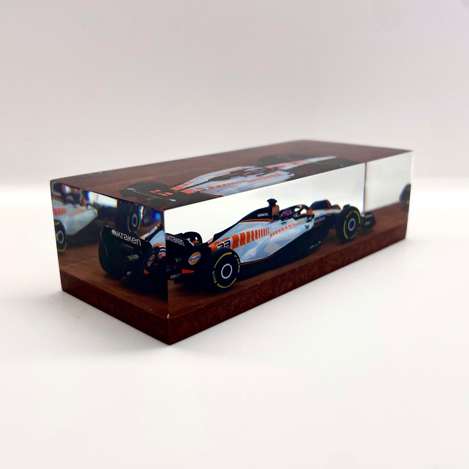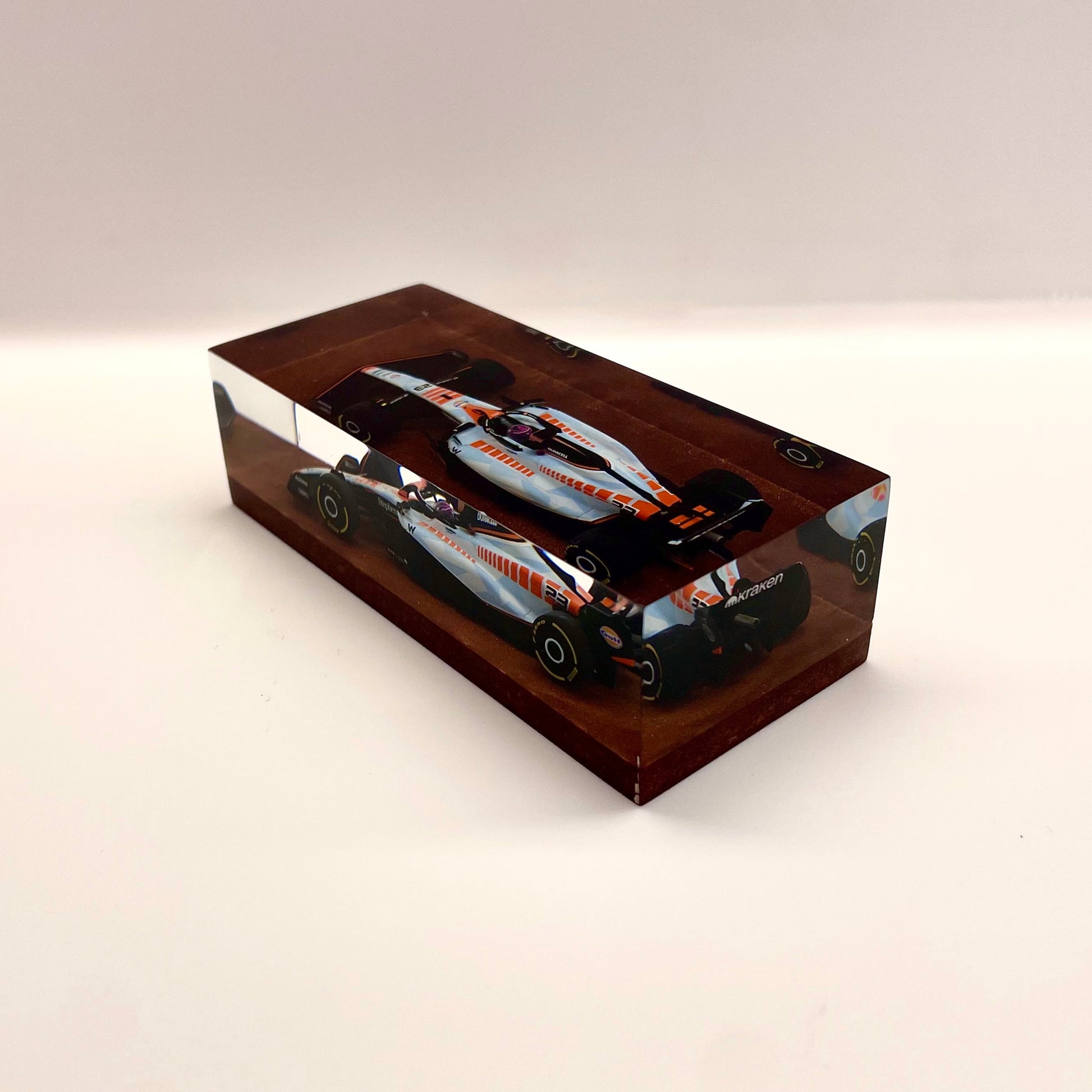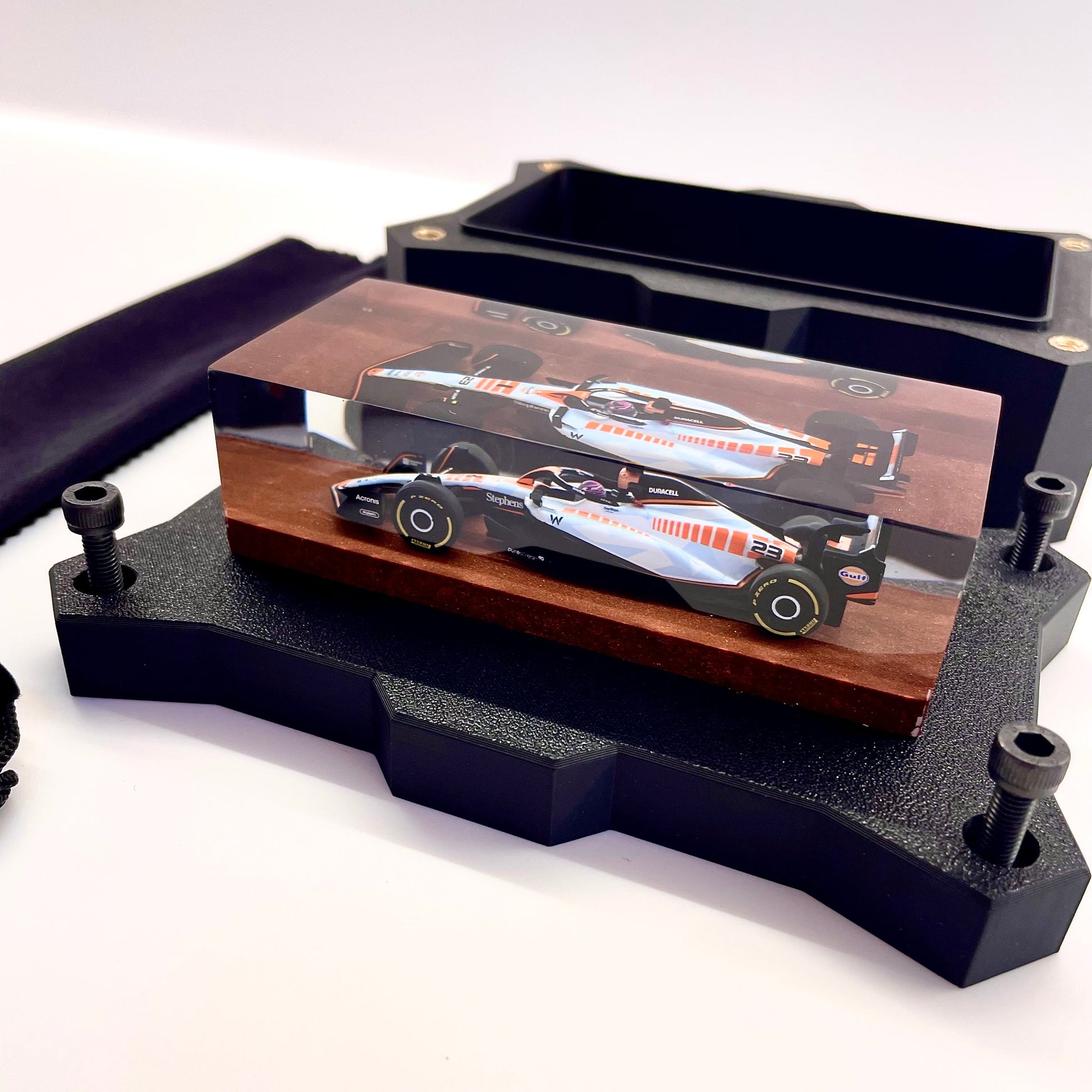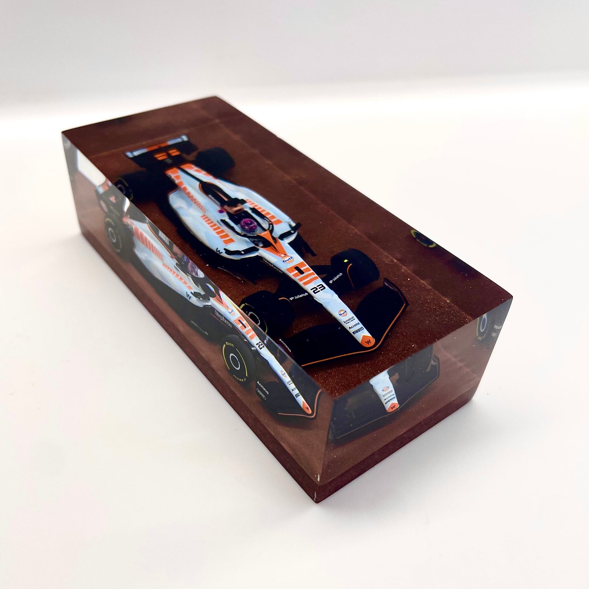 Il protagonista è l’elegante e aggressiva Williams FW45 guidata da Alex Albon durante il Gran Premio di Singapore 2023. Un simbolo di tecnica e velocità reso eterno attraverso un processo scultoreo che congela l’energia della gara in una forma pura e definitiva.