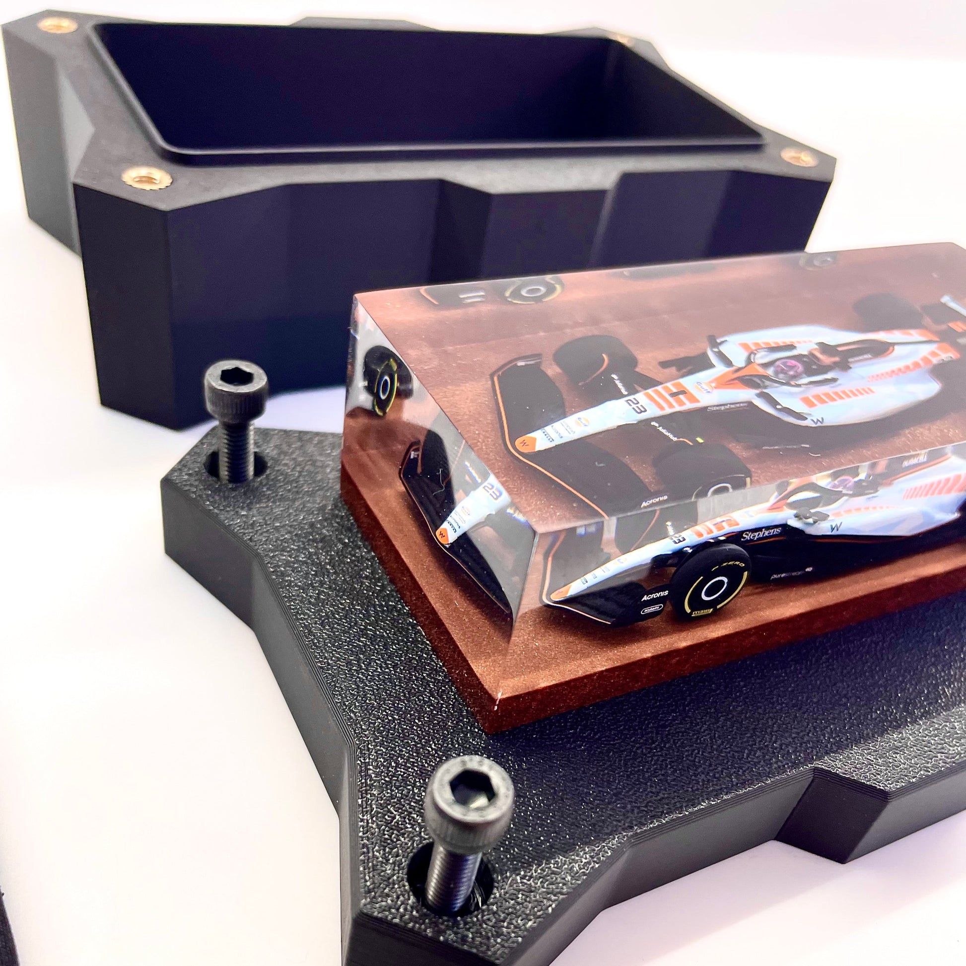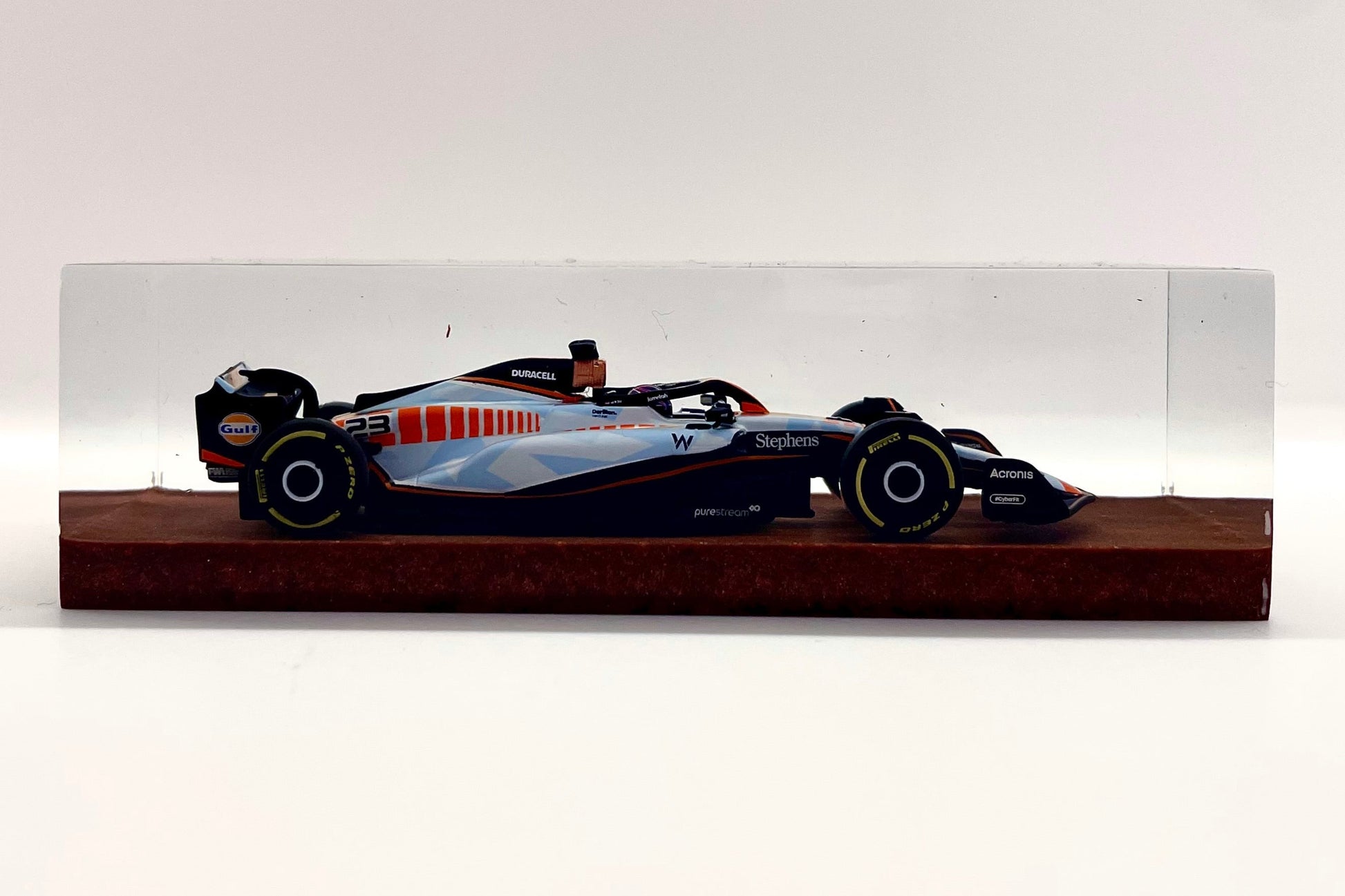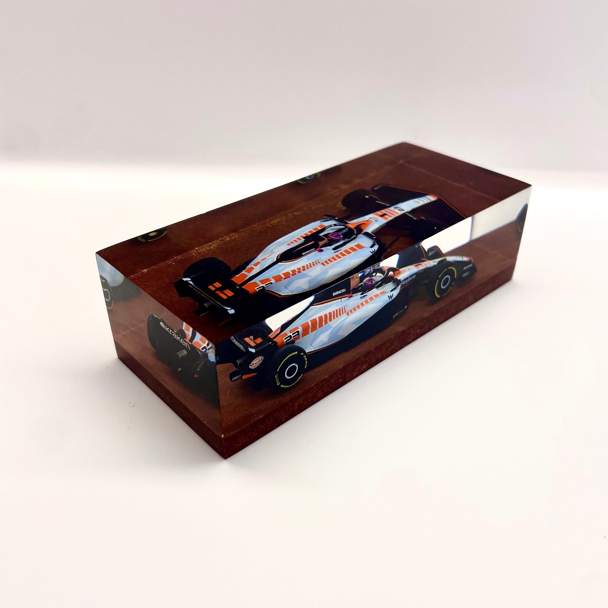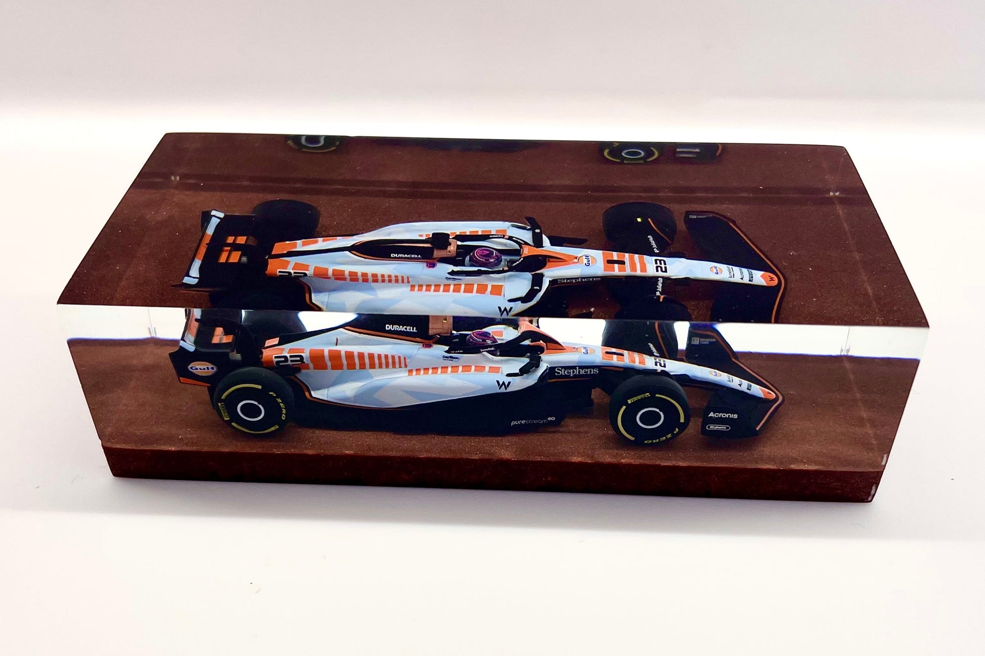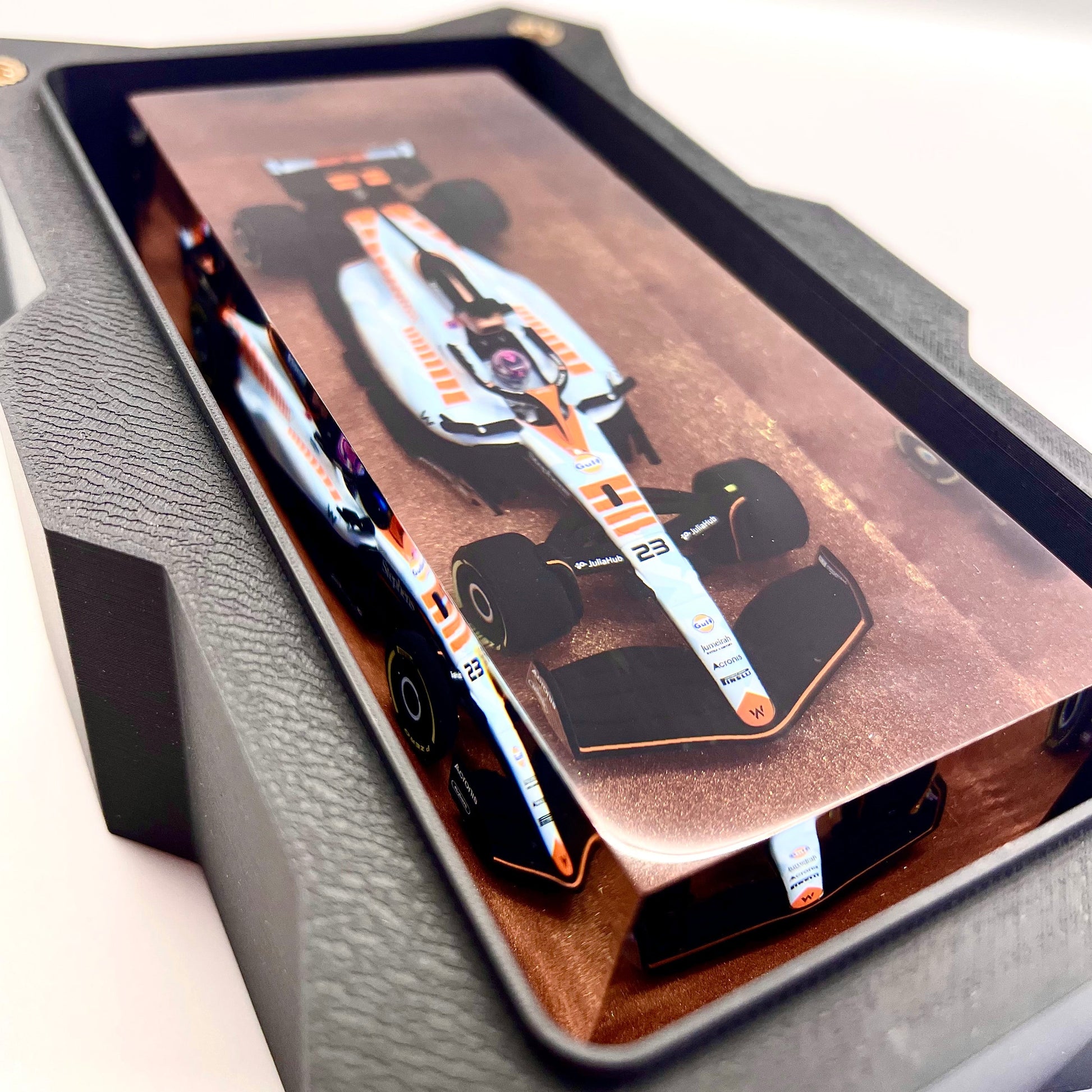 Il protagonista è l’elegante e aggressiva Williams FW45 guidata da Alex Albon durante il Gran Premio di Singapore 2023. Un simbolo di tecnica e velocità reso eterno attraverso un processo scultoreo che congela l’energia della gara in una forma pura e definitiva.