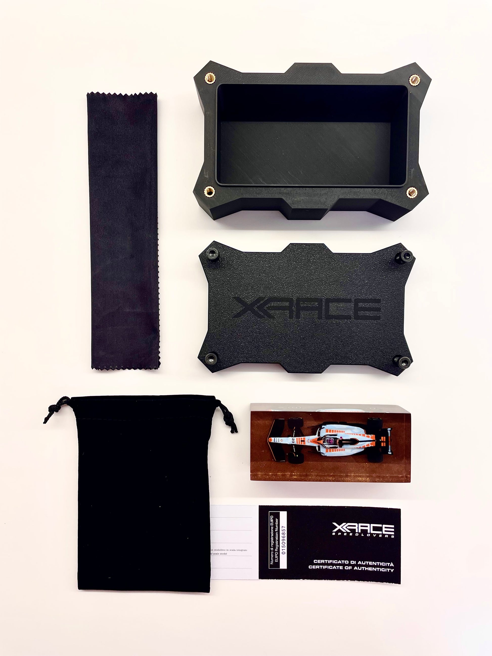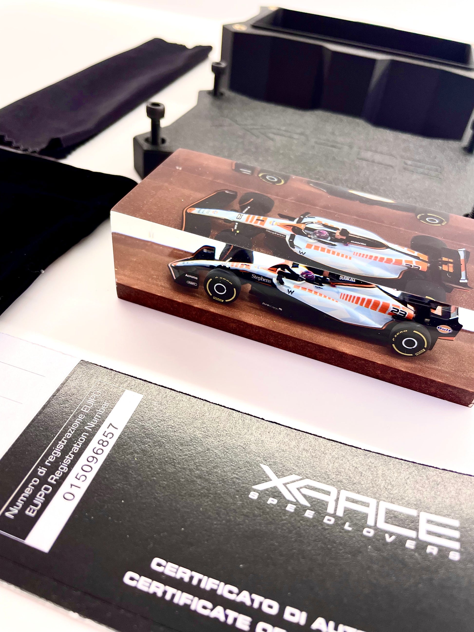 Every detail — from the livery to the dynamic posture — has been crystallized in a numbered, authenticated composition, protected by an officially registered EUIPO design.