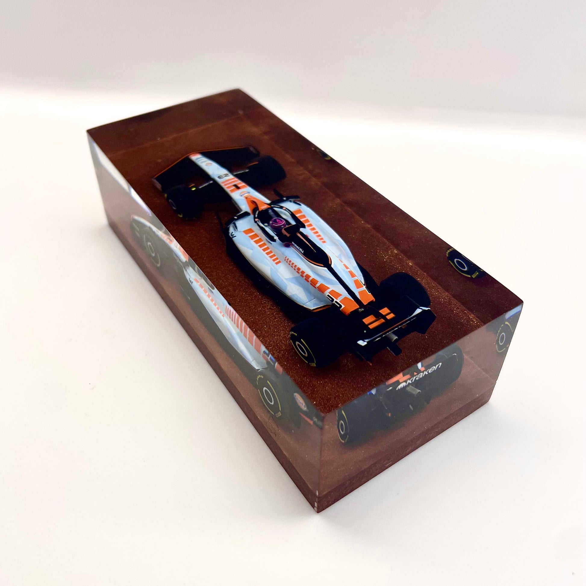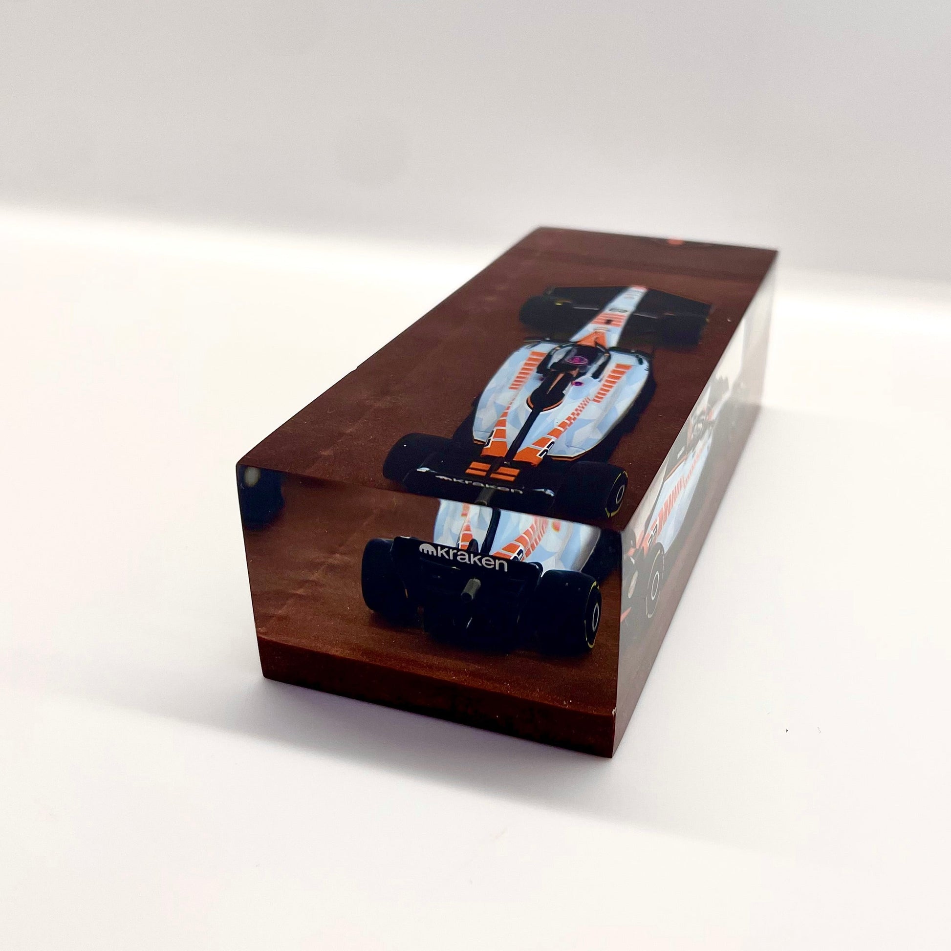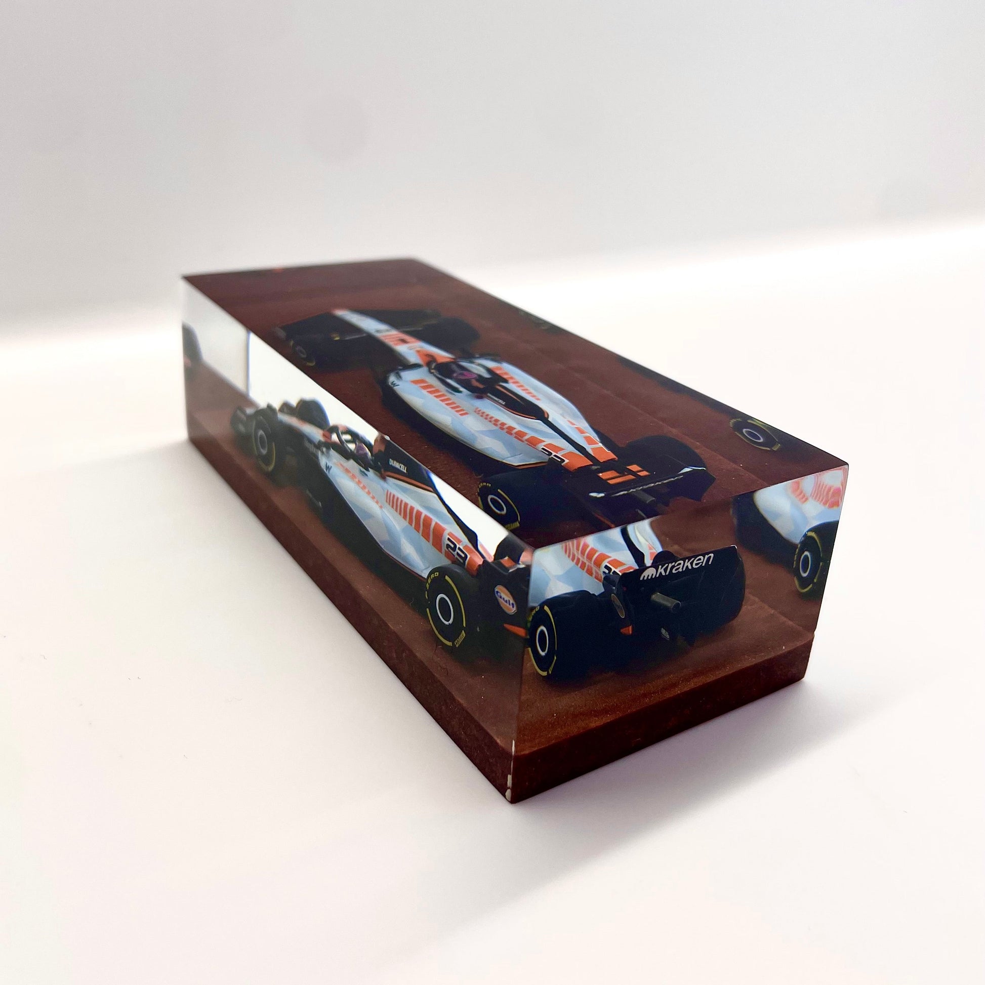 This sculpture is part of the “Velocità Sigillata” series by XRACE Speedlovers — an artistic project that transforms motorsport icons into unique works of art, sealed in transparent blocks with a minimal, timeless design.